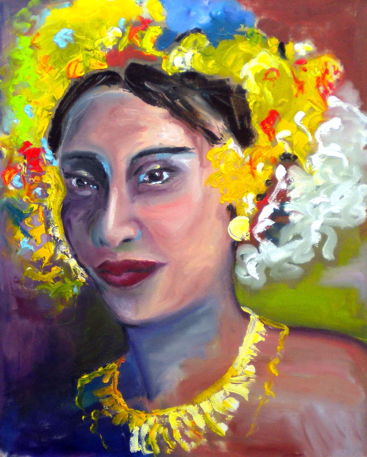 You got beautiful colors and contrast between bold color and mixed color, it is strong expression of eye and dignity face, free touch of decoration of her is very good and enough description to see Balinese lady, yellow makes painting so lively and good support of other colors, good.